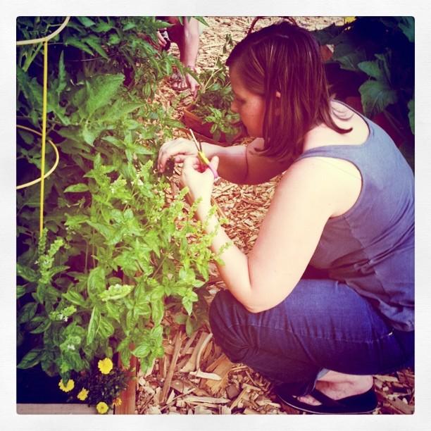 Harvesting basil at the community garden.